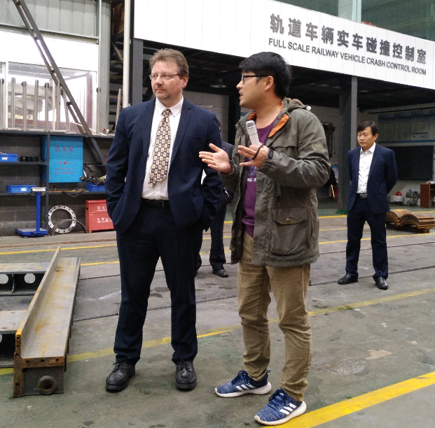 2018年10月25日下午,英国利兹大学常务副校长Hai-Sui Yu率团来访我校,校党委副书记陈治亚与外宾进行了会谈。会谈后,代表团成员利兹大学高速轨道研究院院长Dr.Peter Woodward在国际合作与交流处留学办主任李新华、土木工程三级片 副院长何旭辉的陪同下参观了高速列车研究中心,周伟老师负责讲解接待。