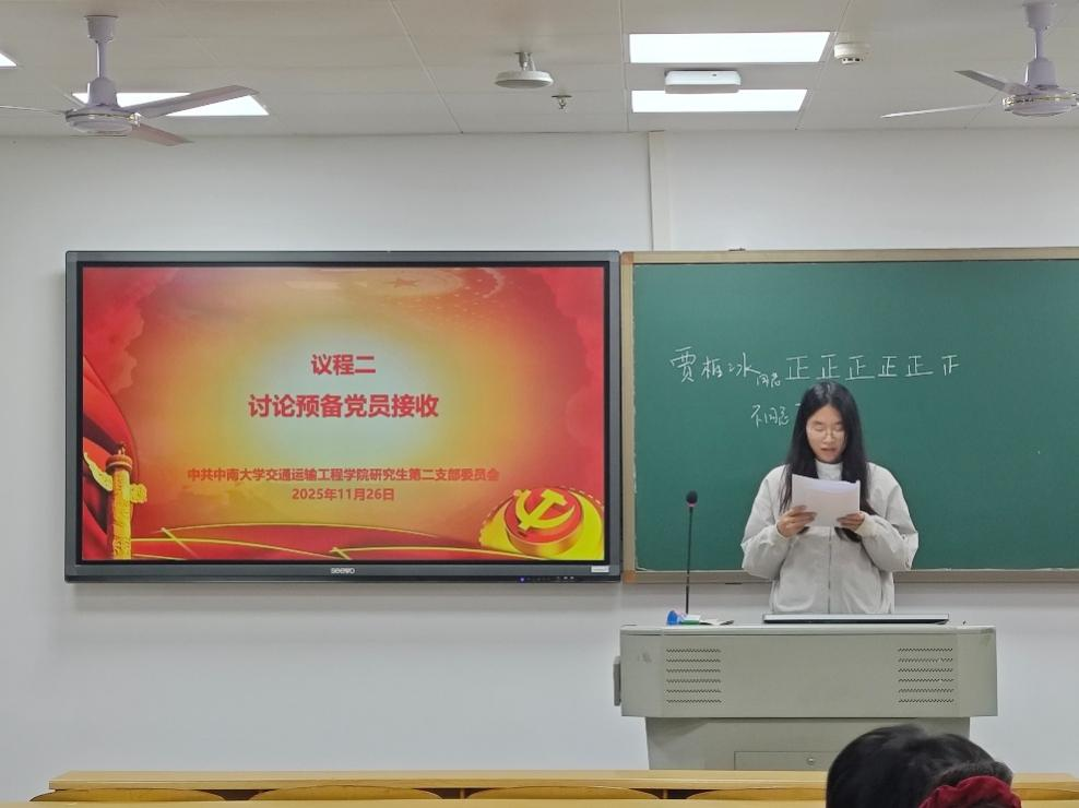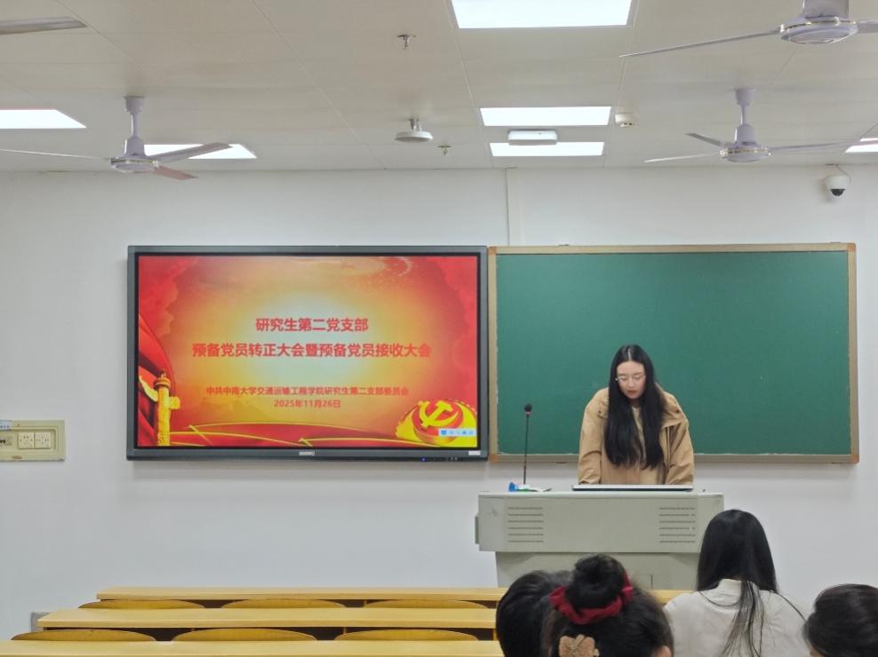 112619:00,研究生第二党支部于世纪楼A105教室举行预备党员接收暨预备党员转正大会。本次会议由支部书记胡奕同志主持,支部全体党员参加会议。本次会议旨在进一步加强支部党员队伍建设,保持党员队伍的先进性和纯洁性,为支部发展注入新的生机与活力。
