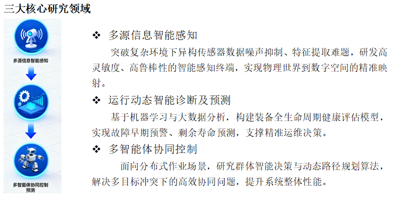 学科优势,面向轨道交通、智能制造等国家战略领域,以智能测控为核心,致力于多源信息感知、动态诊断预测及多智能体协同控制的前沿技术研发与应用,推动高端装备从“被动运维”向“主动智能”升级,助力行业数字化、智能化转型。