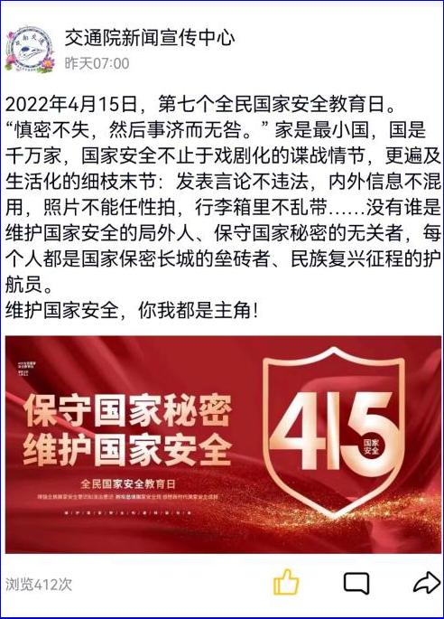 由交通院新闻宣传中心牵头,明确4月15日是第七个全民国家安全教育日,聚焦“树牢总体国家安全教育观,感悟新时代国家安全成就,为迎接党的二十大胜利召开营造良好氛围”的教育主题,普及相关知识,以图文结合的形式在三级片