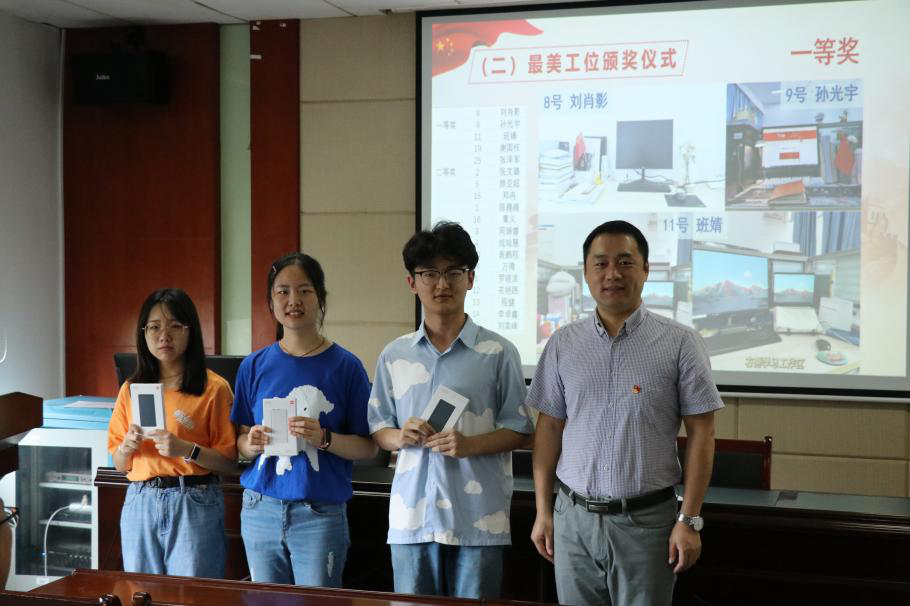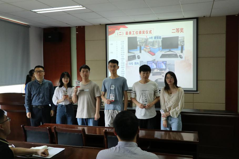 会议伊始,进行“最美工位”的颁奖环节。首先陈峰同志和杜伦平同志颁发三等奖奖品,随后汪馗同志颁发二等奖奖品,最后宋晓东同志为一等奖获得者颁奖。“最美工位”评选活动不仅发动了各位同志对工位进行清洁,保证了学习科研环境的整洁,更在一定程度上提高了科研效率,起到了一举多得的作用。