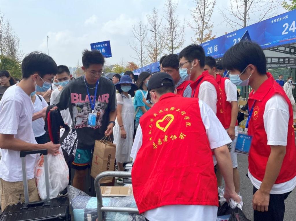 早上七点,志愿者们便已到达各个迎新点做好了准备工作。在新校区接车点,志愿者们正忙碌地为陆续到来的新生们搬运行李,引导新生们前往南校区的宿舍楼,一路上他们带领着新生逐步熟悉校园环境,也耐心地为新生们解答了各种问题,诸如食堂分布、超市位置、校园卡用途等。25栋和32栋楼下的迎新工作者指导着到达宿舍楼的新生们完成了签到和新生注册。