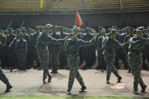 自军训开展以来,每日下训后,交通院2022级新生便在辅导员丁德孝老师和陈晨老师的组织带领下演练红歌。从领唱员、指挥和伴舞的选拔与排练,到道具的选择和队形的安排,两位老师尽心尽力,为本次红歌比赛做好了充足准备。晚上19:00,红歌比赛正式开始,作为第11个出场的连队,五连的表演以戍边英雄为背景,优美的舞蹈和着感情充沛的诗朗诵,在朗诵员铿锵有力的一声“让我们把强军的号角吹响”中拉开了序幕。嘹亮的歌声加之音乐强有力的鼓点,他们用满腔的热情征服了在场观众,最终取得了9.35分的好成绩。
