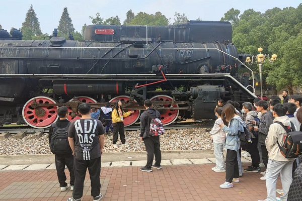 第21期入党积极分子培训班全体学员在班导师陈晨老师的带领下参观铁道校区铁路园与先进轨道交通科普基地。为保证良好的参观体验,培训班全体学员分为两个小组依次参观。