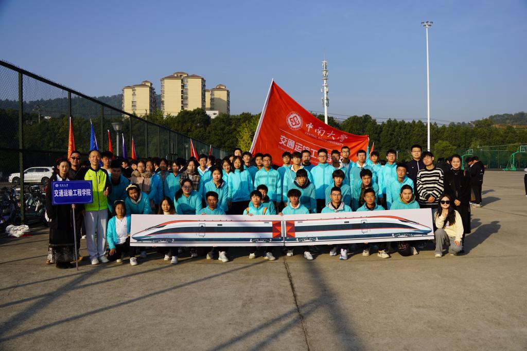 的运动员方阵迈步走来。红色旗帜迎风飘扬,运动员们统一着装,大步向前,展现出交院学子不畏困难、敢于挑战的风采;运动员手持展示中国高铁的方牌,彰显着交院学子对交通强国的不懈追求以及踔厉奋发、报效祖国的决心。