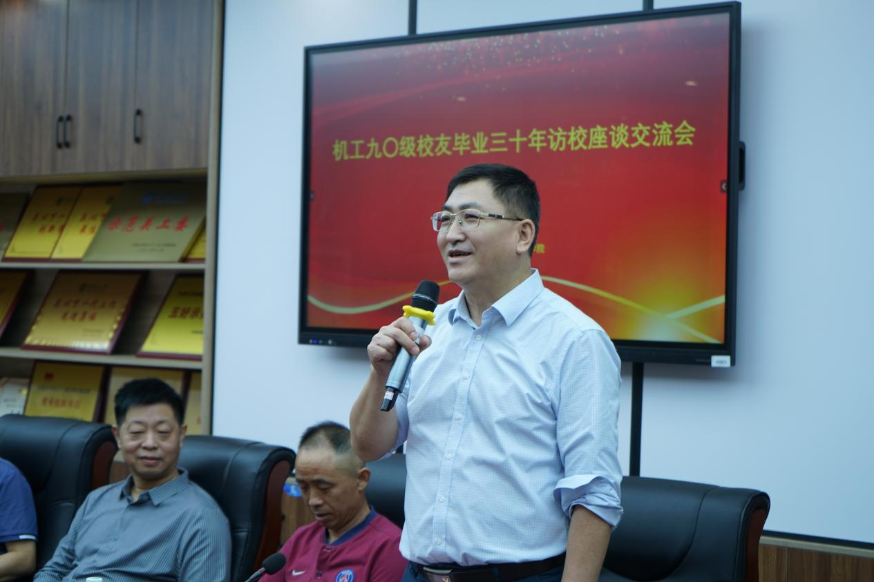 校友代表耿贵斌发言。他表示,校友们阔别母校多年,再次回到校园,一定倍感激动,熟悉的环境和日新月异的设备,更让人深感欣慰。看见母校各项设施在向电动化、智能化不断迈进,作为校友,他深感自豪。