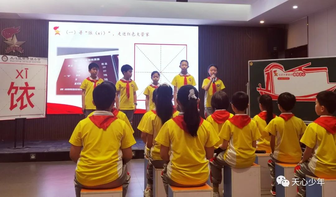 新开铺小学大队辅导员杨艳老师带来的队课展示《红色大管家的创“饻”之心》,创造性地从一个特殊的汉字“饻”来追寻一段艰苦奋斗的革命历史。队员们从字里读到了为人民服务的共产党人精神,并将为人民服务的精神付诸于实践,在实践中帮助队员学好党史,赓续红色血脉。